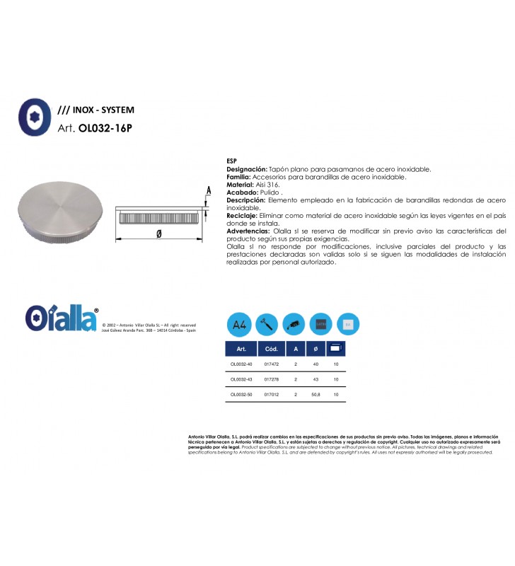 Advertencias: Olalla sl se reserva de modificar sin previo aviso las características del producto según sus propias exigencias.