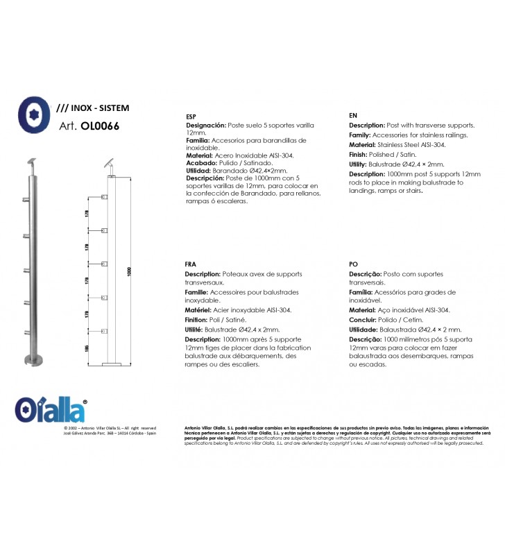 POSTE DE ACERO INOXIDABLE CON TAPÓN Y 5 SOPORTES PARA VARILLA DE 12MM / BRILLO