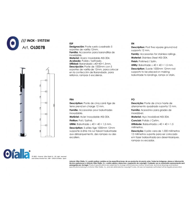 POSTE SELO DE 40X40X1000MM CON SOPORTE FIJO Y 5 SOPORTES PARA VARILLA DE 12MM / BRILLO