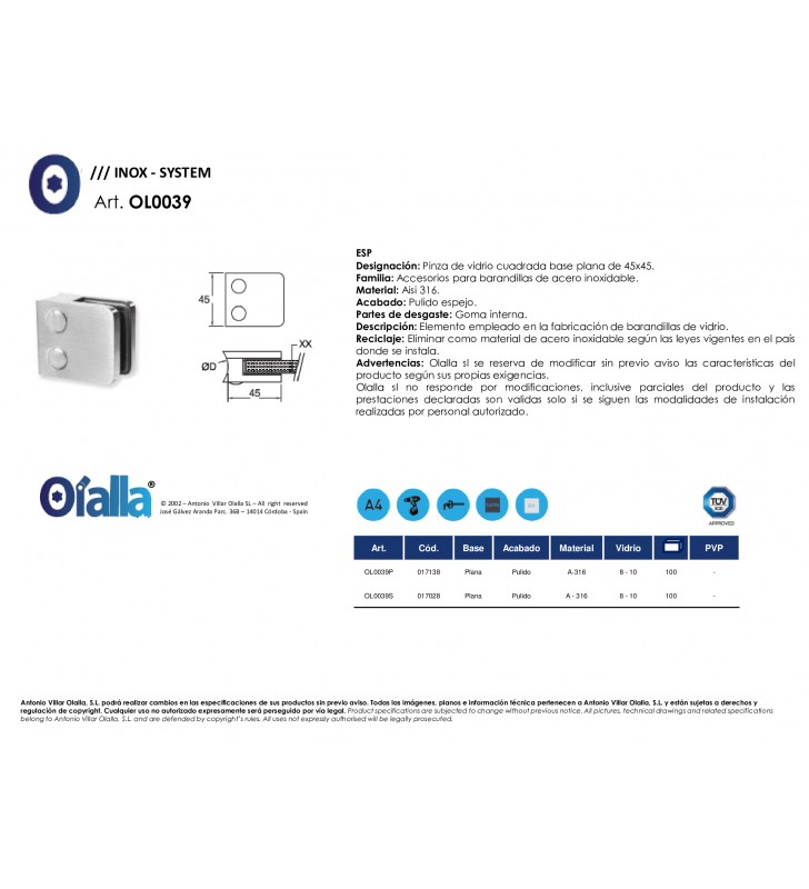 Advertencias: Olalla sl se reserva de modificar sin previo aviso las características del producto según sus propias exigencias.